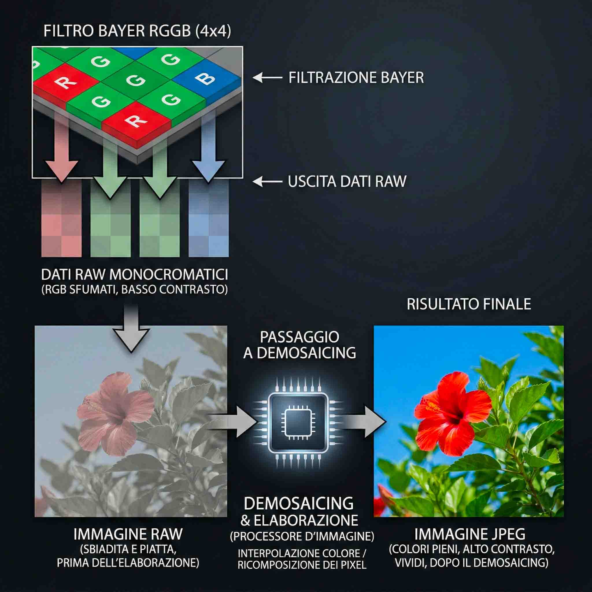 Immaginate un mosaico immenso in cui ogni tassello fa passare solo luce rossa (25%), blu (25%) o verde (50%, per emulare la sensibilità dell'occhio umano). Il file RAW registra solo questa scacchiera monocromatica. L'immagine vi appare piatta perché il file non è ancora stato tradotto nei colori reali (un processo matematico complesso chiamato demosaicing) e, soprattutto, perché la macchina non ha applicato nessuna "Curva a S" per il contrasto.